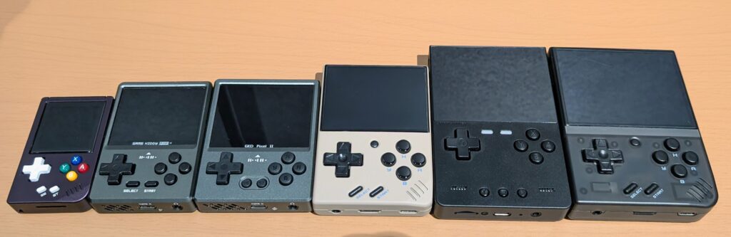 画像左から「RG Nano」、「GKD Pixel」、「GKD Pixel2」、「Miyoo mini」、「TRIMUI BRICK HAMMER」、「Miyoo mini Plus」の順で並んでいます。