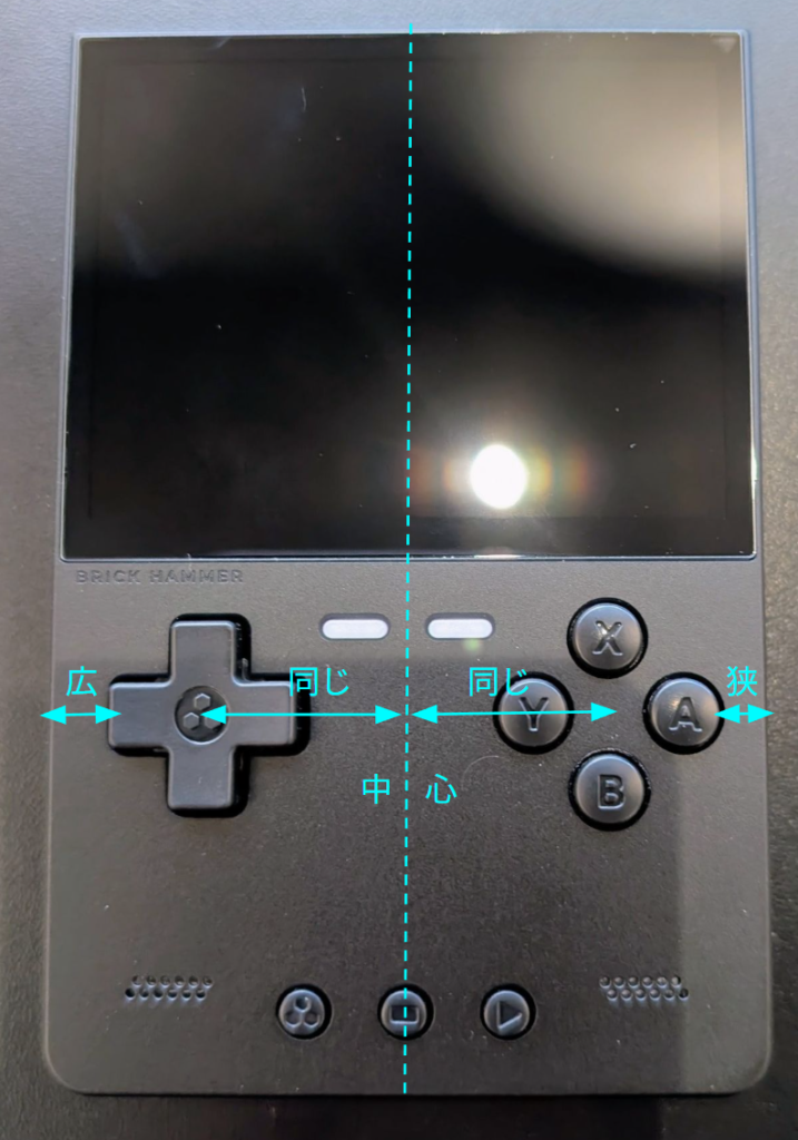 気になったのは、「左右の余白」のズレです。 一見シンメトリーに見えますが、定規を当ててみると衝撃の事実が。 十字キーから側面までは約7mmあるのに対し、Aボタンから側面までは約4mmしかないのです。