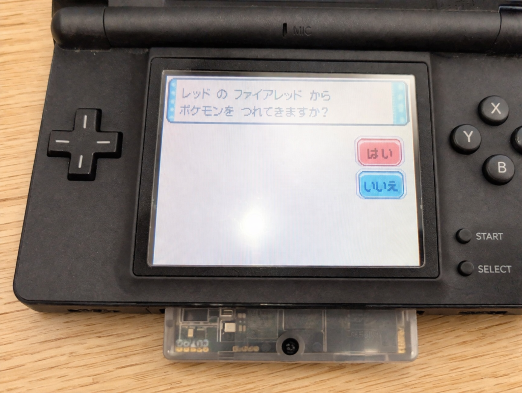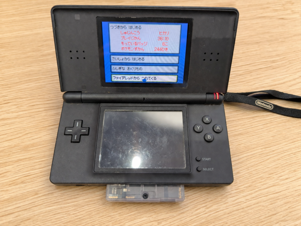 従来のEverDrive GBAではこの機能が搭載されていないため、DS側との通信機能は使うことができませんでした。しかし、今回からフラッシュカートリッジ側で起動モードを変更することで、最後に起動したROMをDS側が読み込むような切り替えモードが追加されたため、DS側とも通信が可能となりました。実際に確認してみると、正しくGBAにあるゲームデータを読み込んでいました。