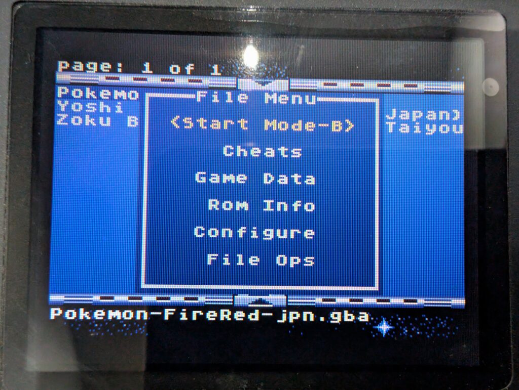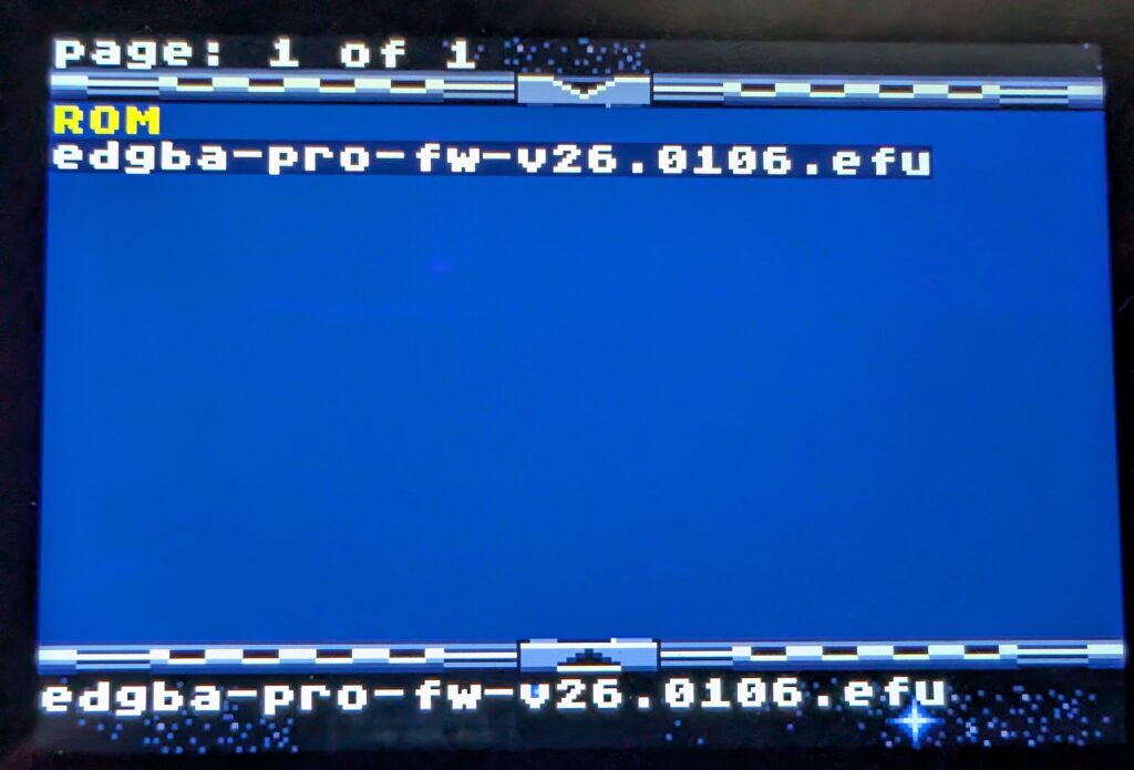 GBA本体にEverDriveを挿して起動すると最初このような画面になるので、先ほどSDカード直下に保存したファームウェアをAボタンで選択するとアップデートが始まります。すぐ終わるのでお待ちください。