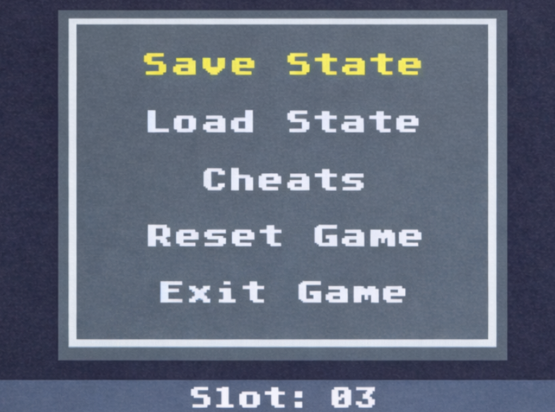 Save Stateを選べば、直前まで遊んでいた状態でゲームの内容が保存されるので、ゲーム側でセーブをしていなくても場面セーブが可能となっています。またLoad Stateを選べば、Save Stateで保存していたデータを呼び出すことができます。