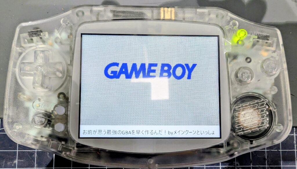 でも今回のIPS液晶、ただのIPS液晶じゃなくて、画面下の「GameBoy Advance」ロゴ部分まで液晶化されてて、好きな画像を表示できるらしいんです。