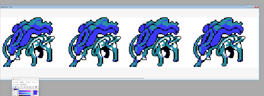 つまり、オリジナルのスイクンのドット絵を見ながら、リサイズ用にドットを打ち直すという苦行が発生しました。本当につらかったです。