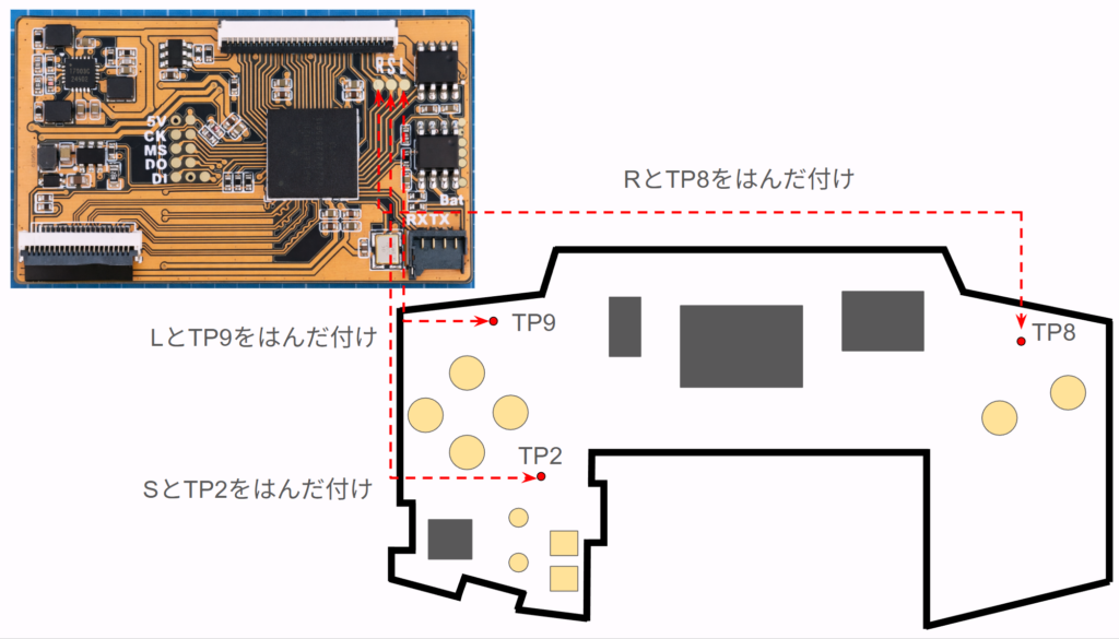 上記の画像のようにGBA基板のTP8/TP2/TP9と、IPS液晶の基板のR/S/Lの位置をはんだ付けしてください。