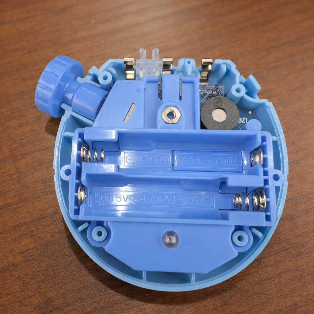 単4電池を2本とも外して電源を切ったら、本体背面の4つのねじをプラスドライバーを使用して外します。すると、本体背面シェルが外れて下記の画像のような形になると思います。
