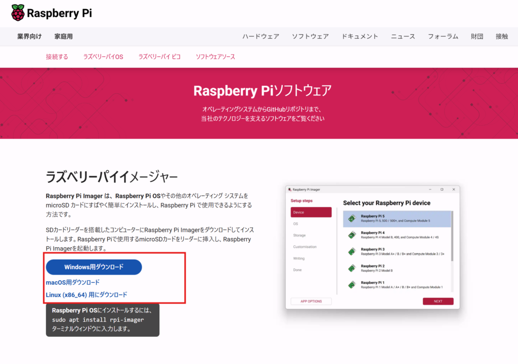 以下のサイトよりRaspberry Pi Imagerをダウンロードしてください。