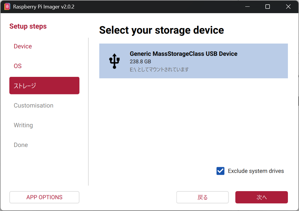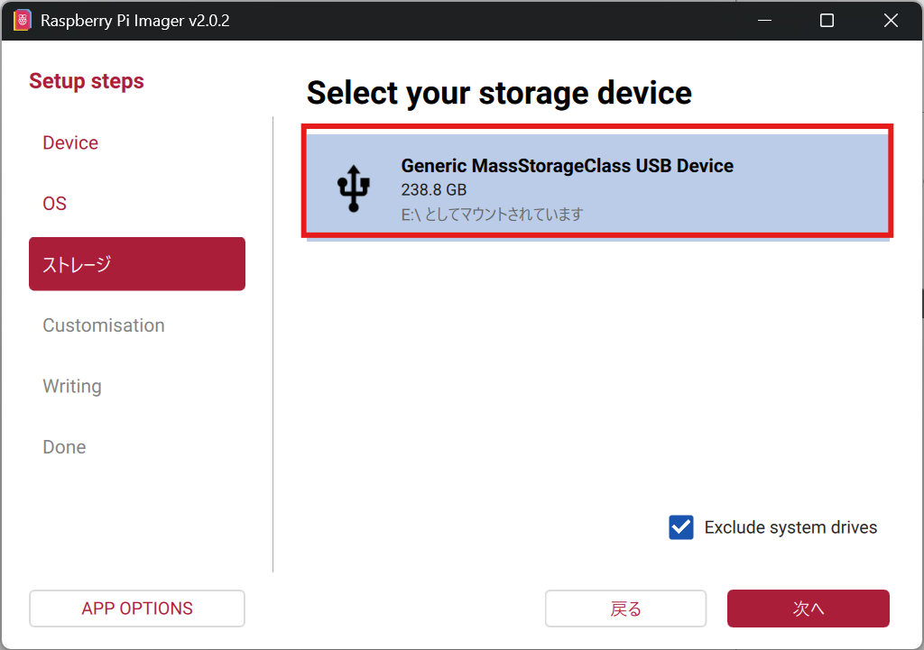 イメージファイルを選択後、「ストレージ」タブで先ほどフォーマットしたmicroSDカードを選択します。