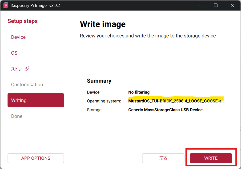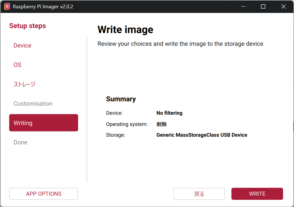 最後に「Writing」タブでWRITEをクリックしたらフォーマットが開始されます。