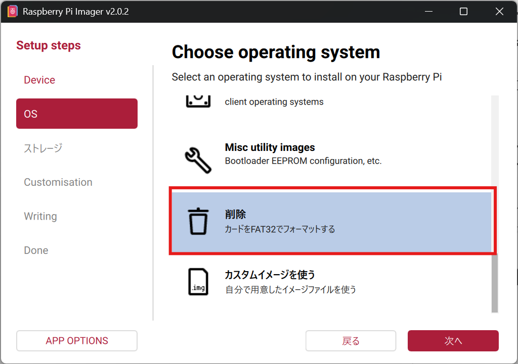 続いて、「OS」タブで「削除」を選択してmicroSDカードをFAT32形式でフォーマットを選択します。