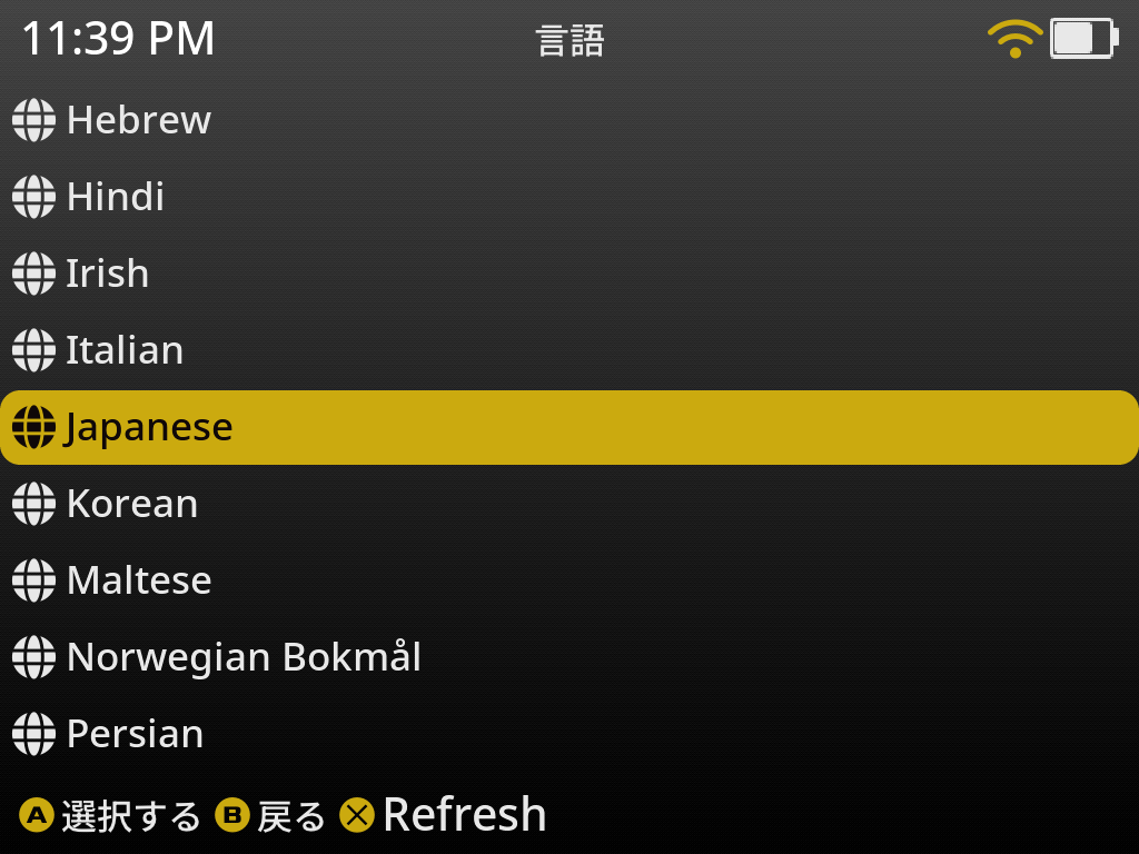 言語の一覧の中から「Japanese」を選択します。これで日本語画面に切り替わるかと思います。
